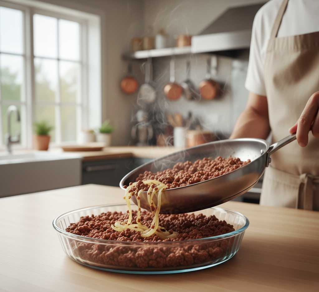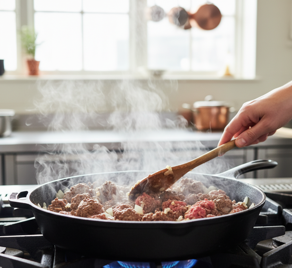 Heat olive oil in a large skillet over medium heat. Add ground beef and cook until browned, breaking it apart with a spoon. Drain excess grease if needed.