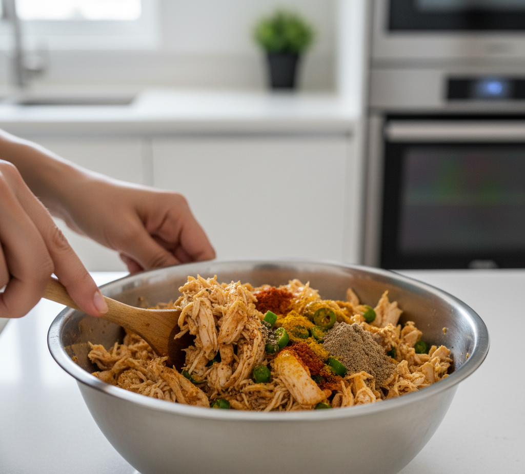 In a large bowl, combine shredded chicken, green chilies, chili powder, cumin, salt, pepper, and sour cream (if using). Stir until evenly mixed.