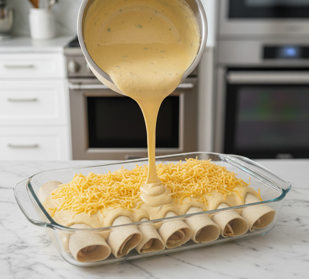 Pour queso sauce evenly over the rolled enchiladas, making sure they’re fully coated. Sprinkle shredded Monterey Jack or cheddar cheese on top.