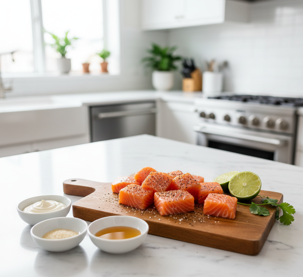 Cut the salmon into 1-inch cubes. Pat dry thoroughly. Toss with olive oil, garlic powder, paprika, salt, pepper, and cornstarch until evenly coated.