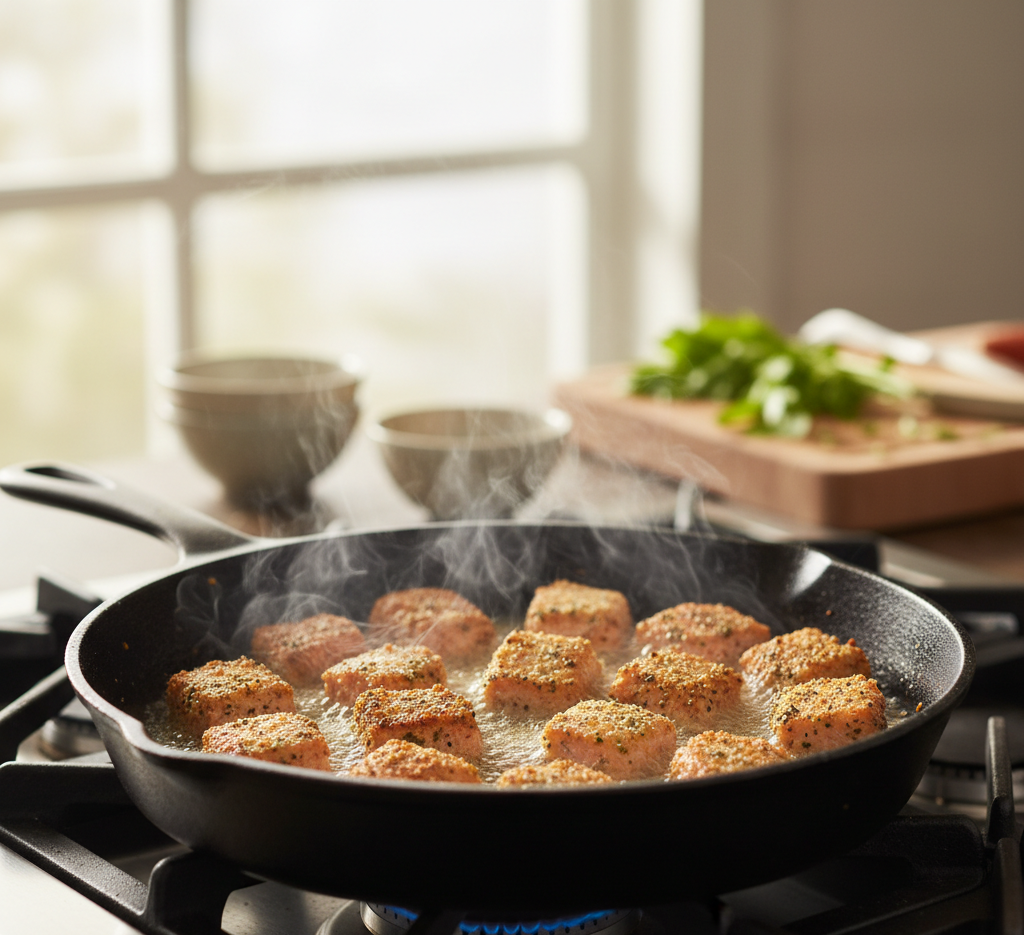Heat a large skillet over medium-high heat. Add a drizzle of oil and arrange salmon pieces in a single layer. Cook for 2–3 minutes per side until golden brown and cooked through.