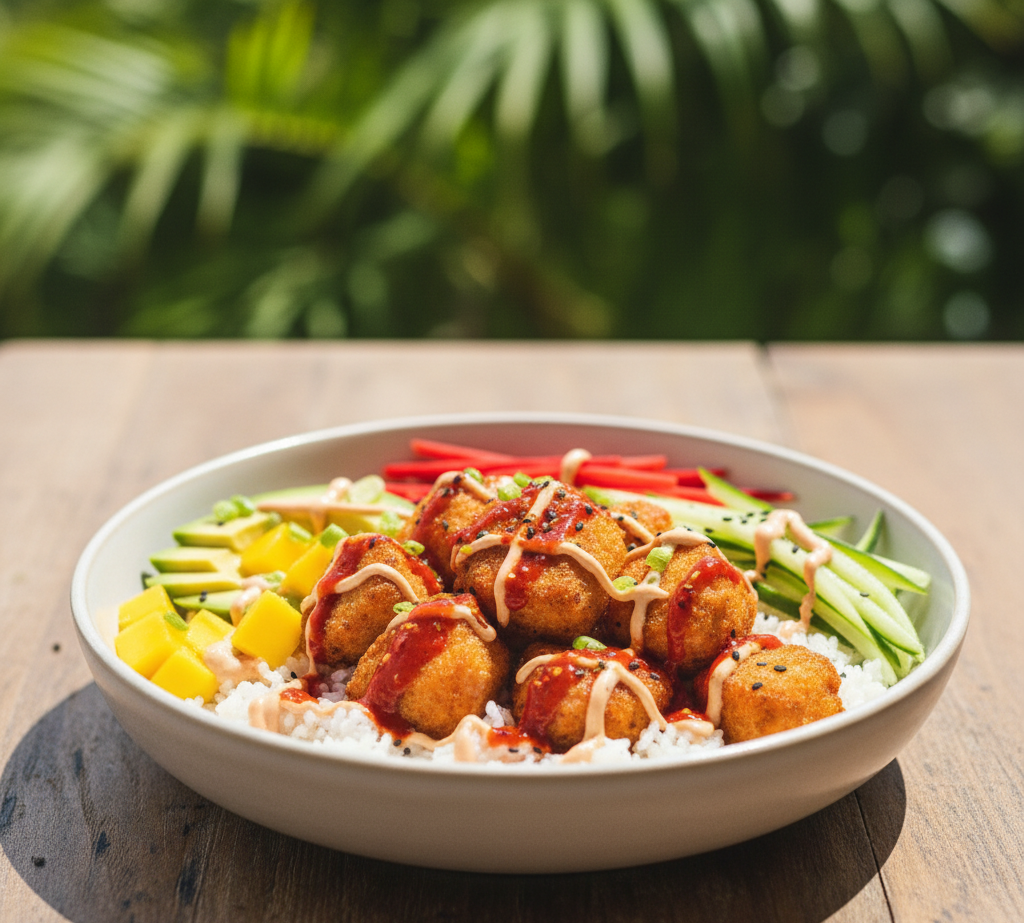 Start with a base of warm rice. Top with crispy salmon bites, fresh vegetables, and a generous drizzle of bang bang sauce. Garnish with green onions and sesame seeds.
