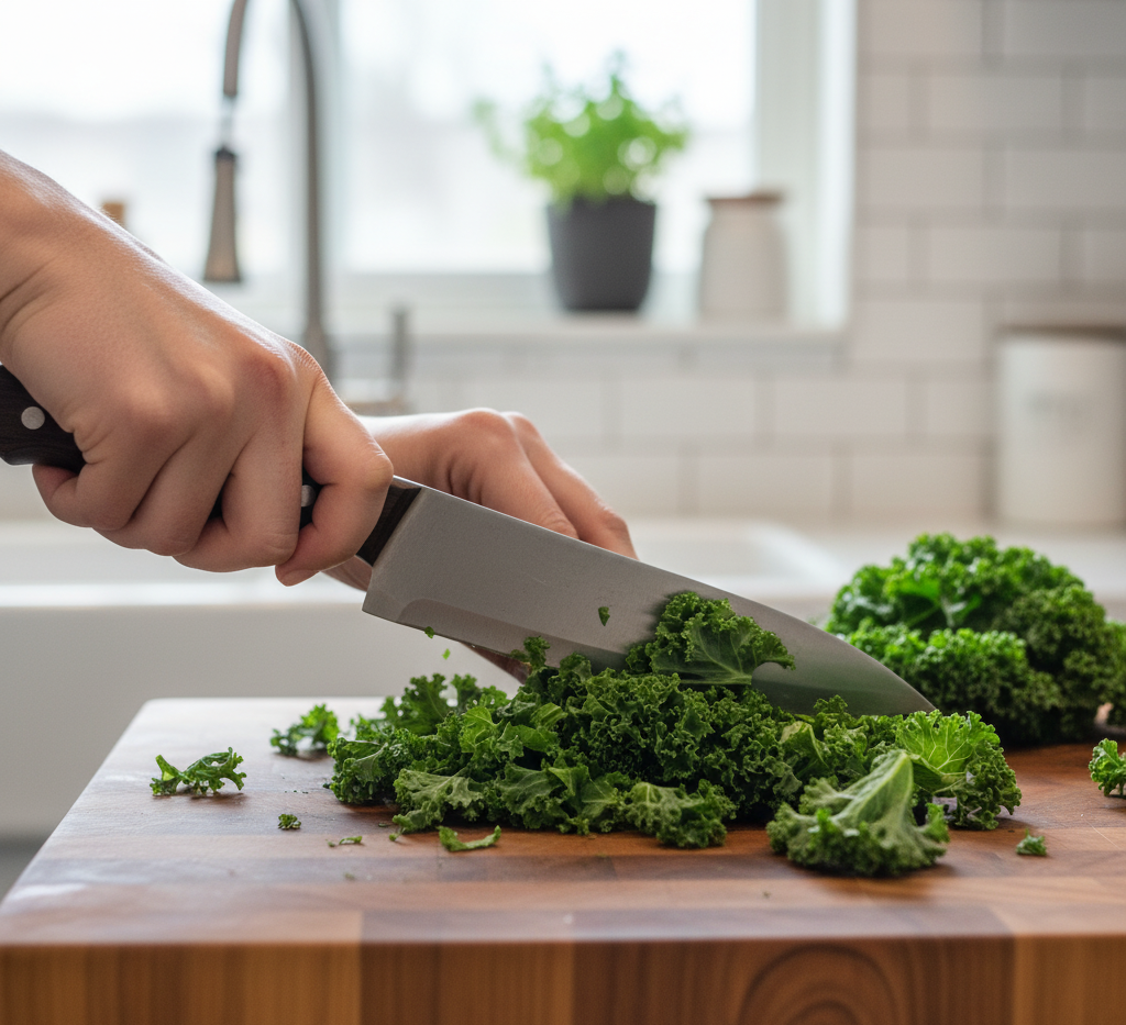 Wash and dry the kale thoroughly. Remove the tough stems and chop the leaves into bite-sized pieces.