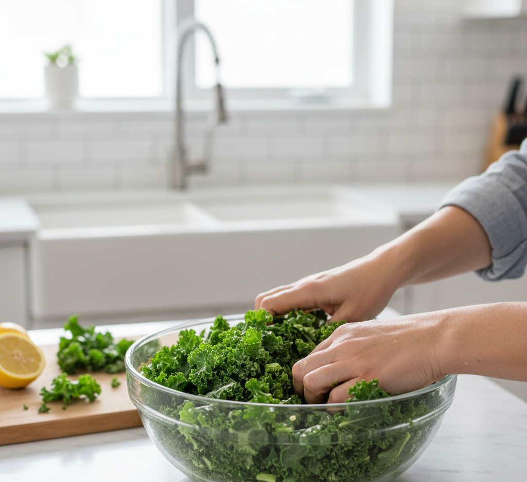 Massaging the kale with lemon juice and olive oil also helps soften the leaves and reduce bitterness.