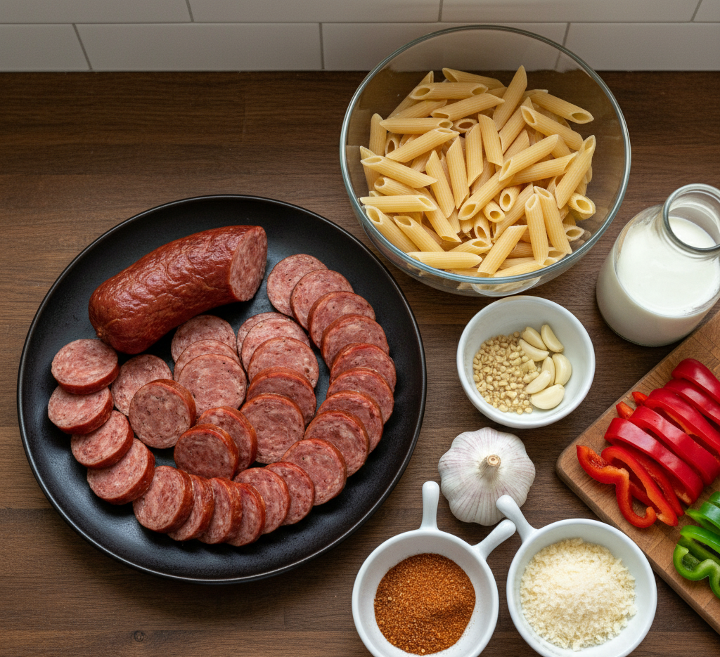 Using the right ingredients ensures your Cajun smoked sausage pasta turns out rich, flavorful, and perfectly balanced.