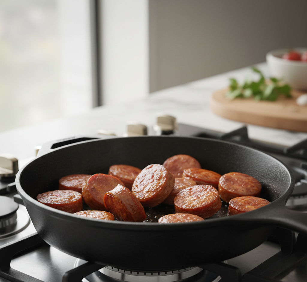 Heat olive oil in a large skillet over medium heat. Add the sliced smoked sausage and cook for 4–5 minutes until lightly browned.