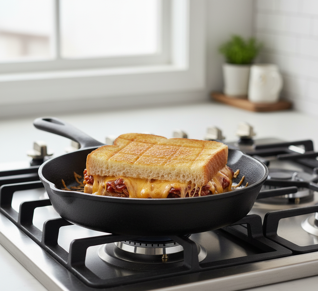Heat a skillet over medium heat. Place the sandwich in the skillet and cook for about 3–4 minutes per side until the bread becomes golden brown and the cheese melts.