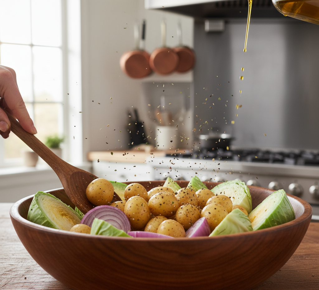 Bake for 30–35 minutes, stirring halfway through to ensure even roasting. The potatoes should be tender and golden, and the cabbage edges slightly caramelized.