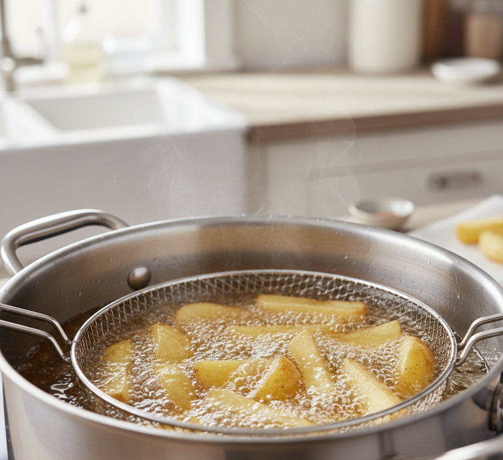 Heat oil to 325°F and fry the potatoes for 3–4 minutes until soft but not browned. Remove and set aside.