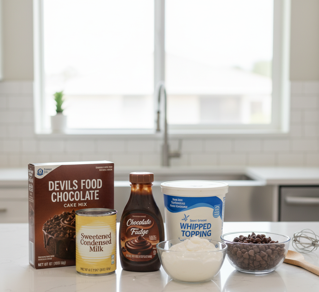 To make the ultimate Death By Chocolate Poke Cake, gather these ingredients: