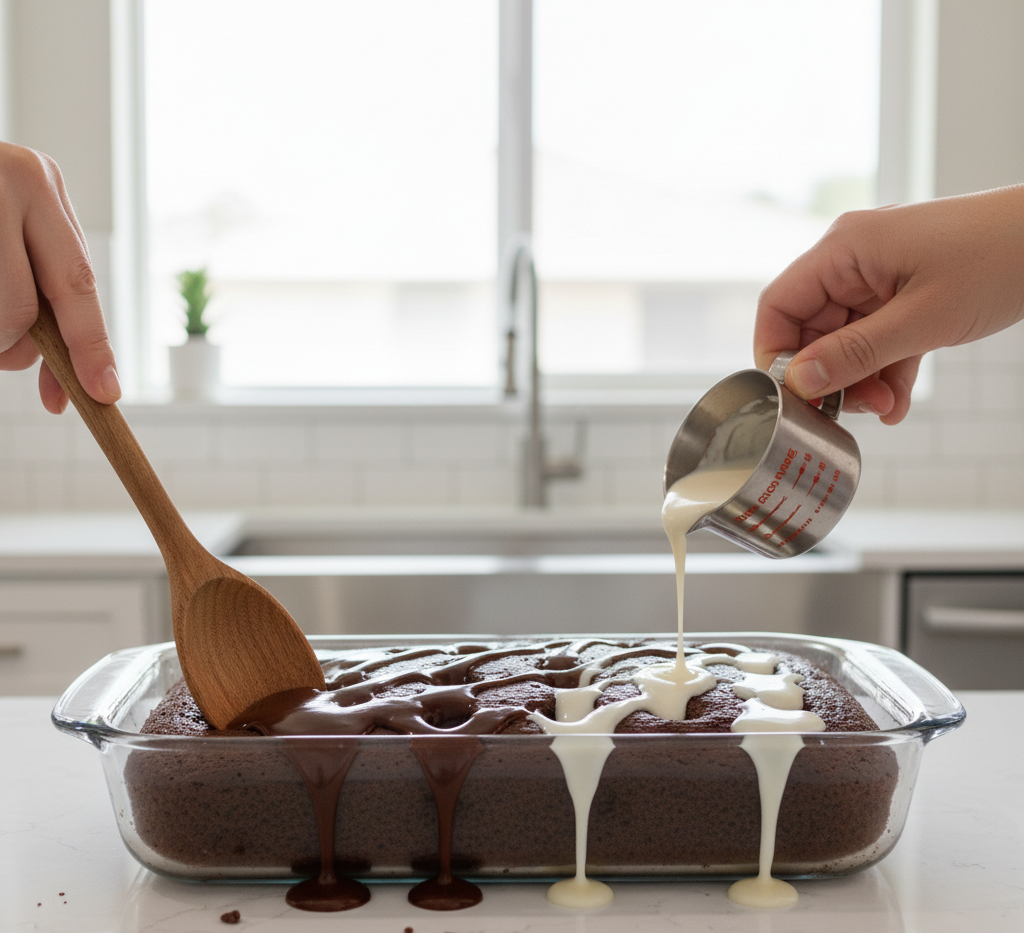 Pour the sweetened condensed milk and chocolate fudge sauce over the cake, allowing it to seep into the holes.