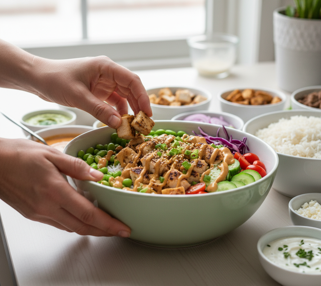 Start with a base of rice, then layer protein, vegetables, and toppings.