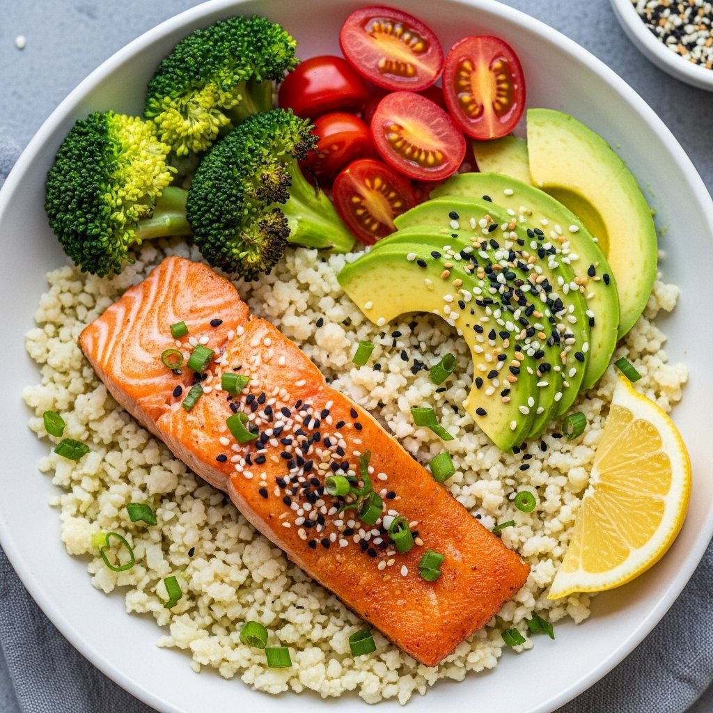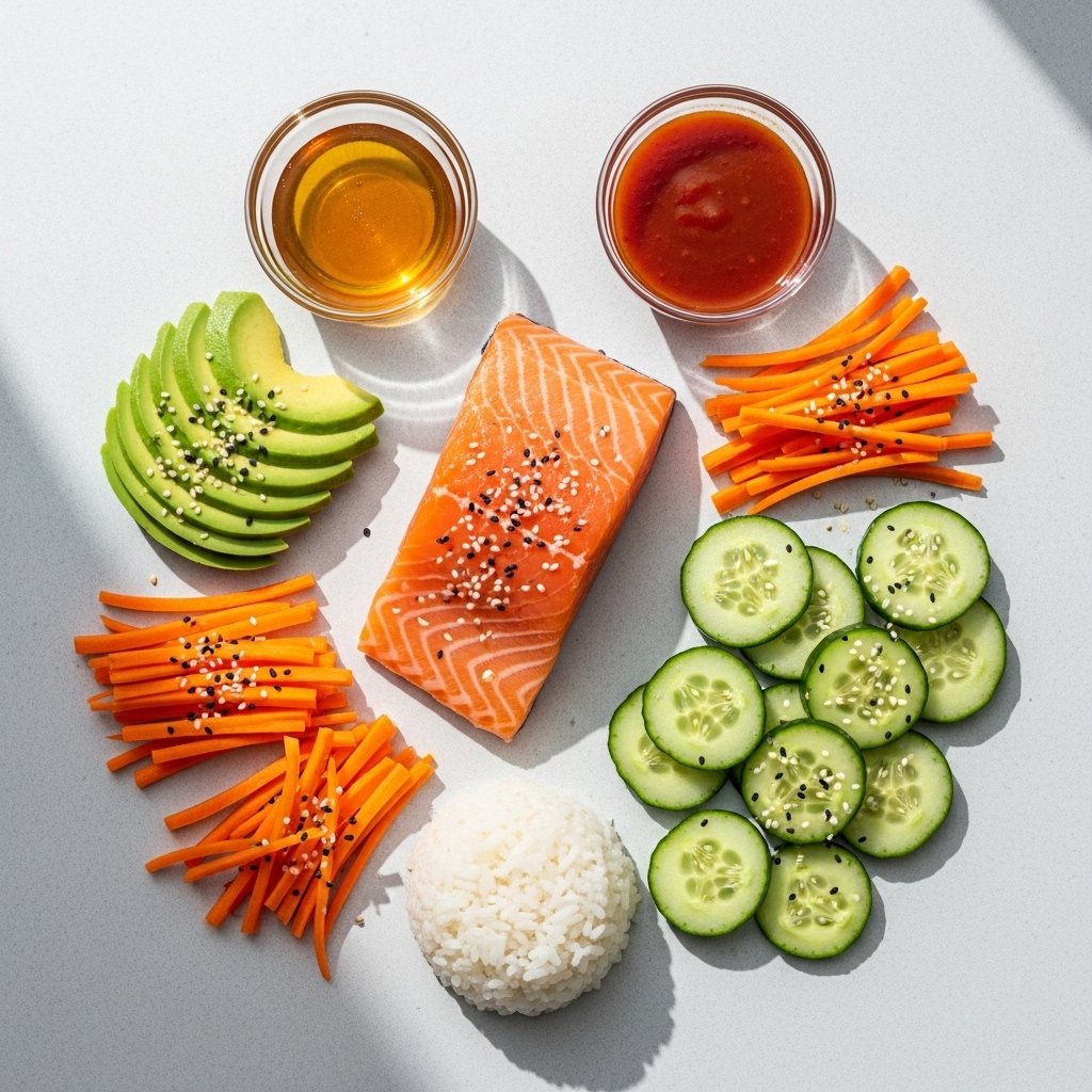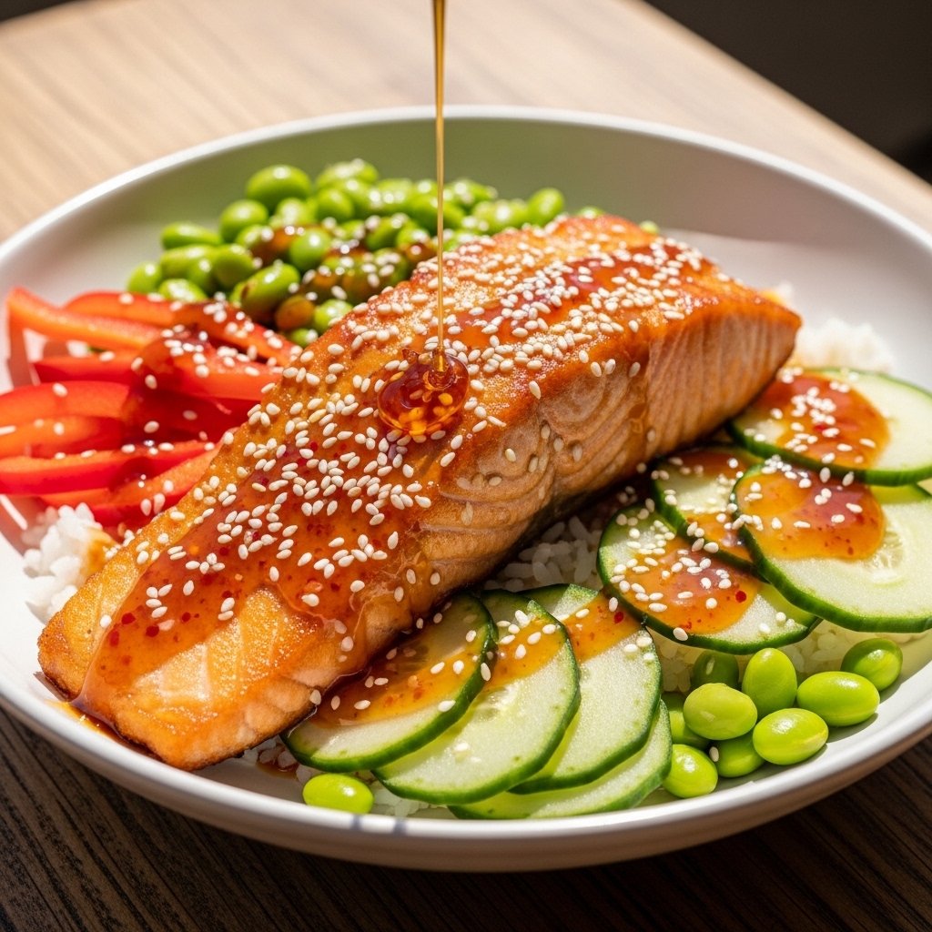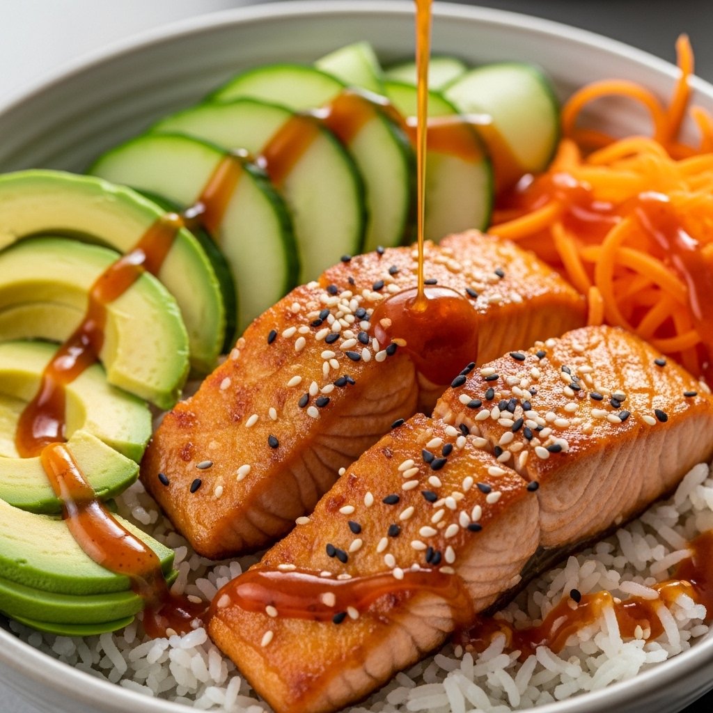 Using fresh vegetables keeps the bowl light and refreshing, balancing the richness of the salmon and sauce.