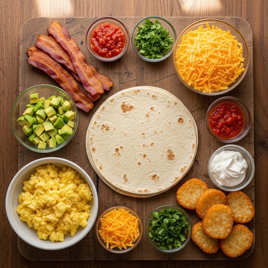 Image Prompt: Ingredients neatly arranged on a kitchen counter including tortillas, eggs, cooked bacon, shredded cheese, hash browns, and small bowls of toppings, natural daylight, overhead shot, high detail, 4k resolution