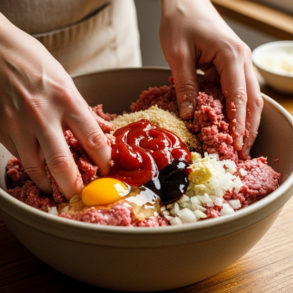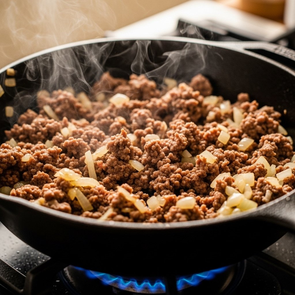 In the same pan, cook ground beef with onion, salt, and pepper until browned. Stir in ketchup, mustard, and Worcestershire sauce.