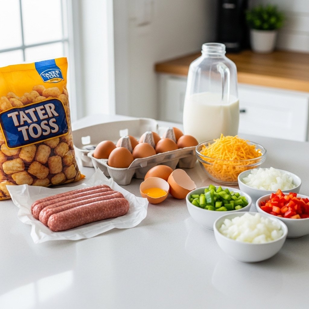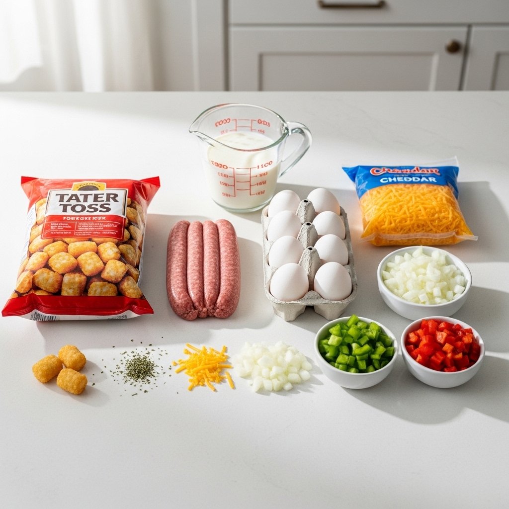 To make this tater tot breakfast casserole recipe, you’ll need:
