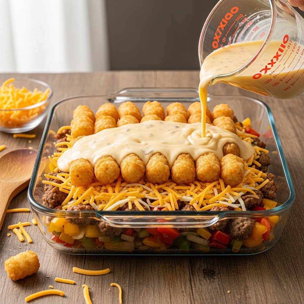 Frozen tater tots are key for that crispy, golden top layer.