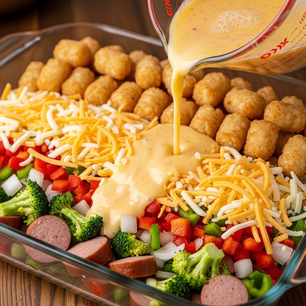 Layer sausage, vegetables, cheese, and tater tots in baking dish.