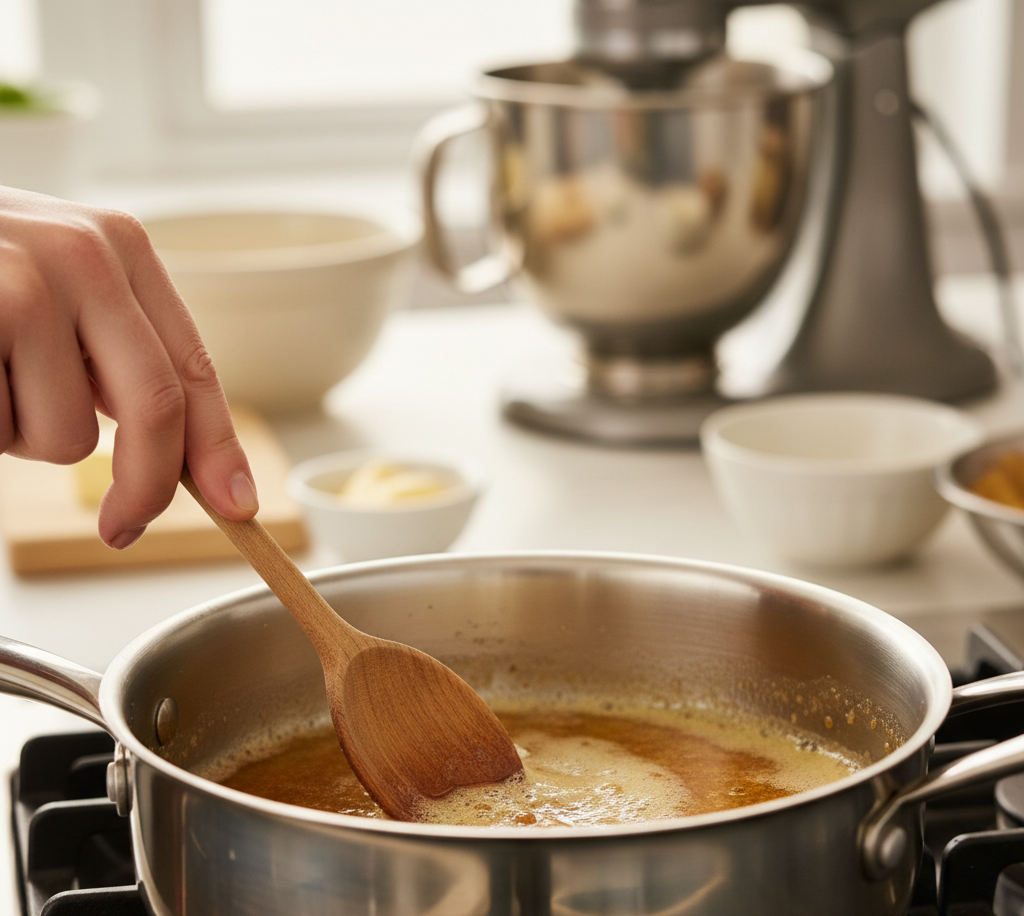 In a saucepan, melt the butter over medium heat. Continue cooking until it turns golden brown and smells nutty. Let it cool slightly.