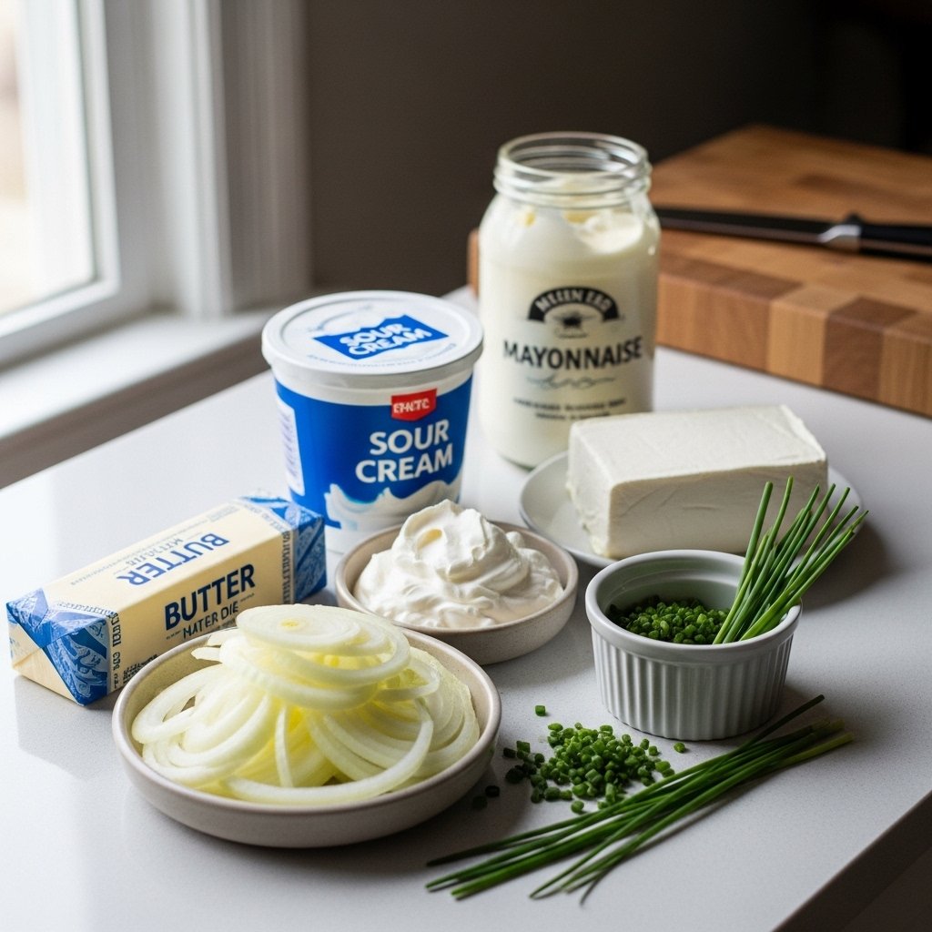 To make this caramelized onion dip – snack recipe, you’ll need just a few simple ingredients: