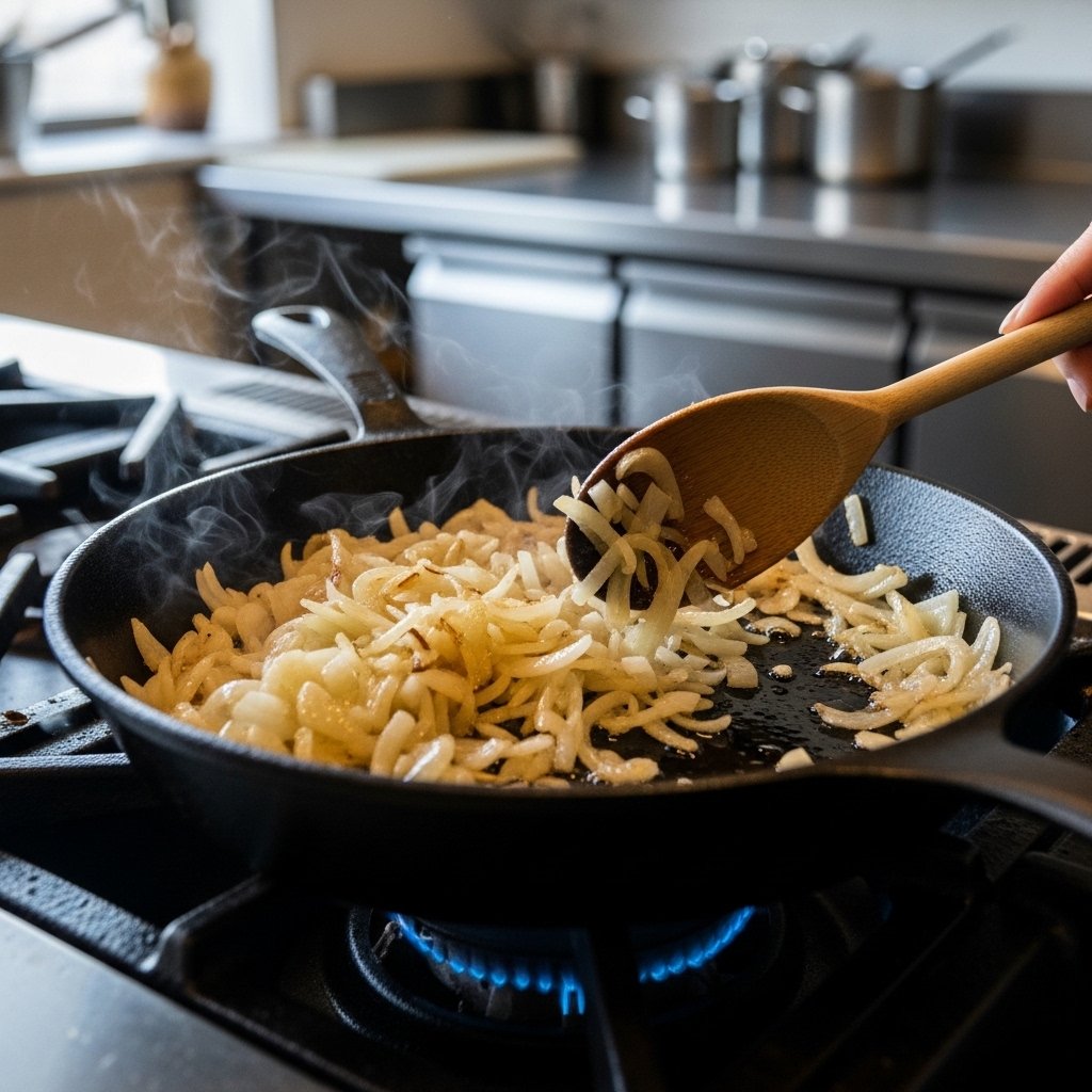 3. Cook slowly, stirring occasionally, for 25–30 minutes until golden brown.