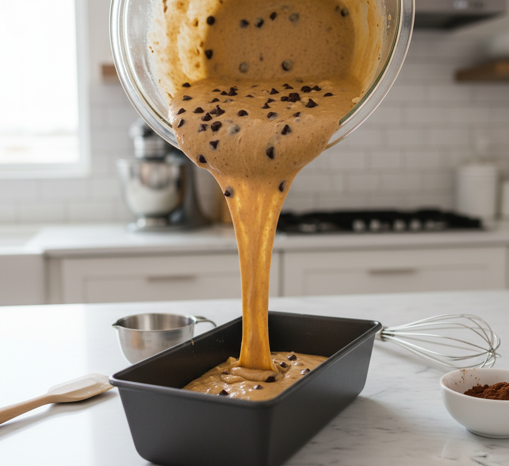 Pour the batter into your prepared loaf pan and bake for 55–65 minutes, or until a toothpick inserted in the center comes out mostly clean.