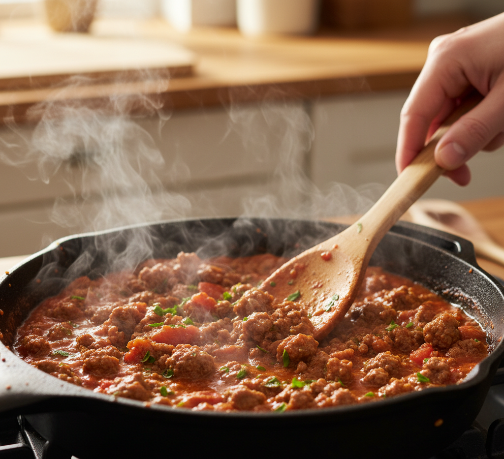 In a large skillet, cook ground beef and sausage with chopped onion and garlic until browned. Drain excess fat, then stir in crushed tomatoes, tomato paste, and seasonings. Let simmer for 20–30 minutes.