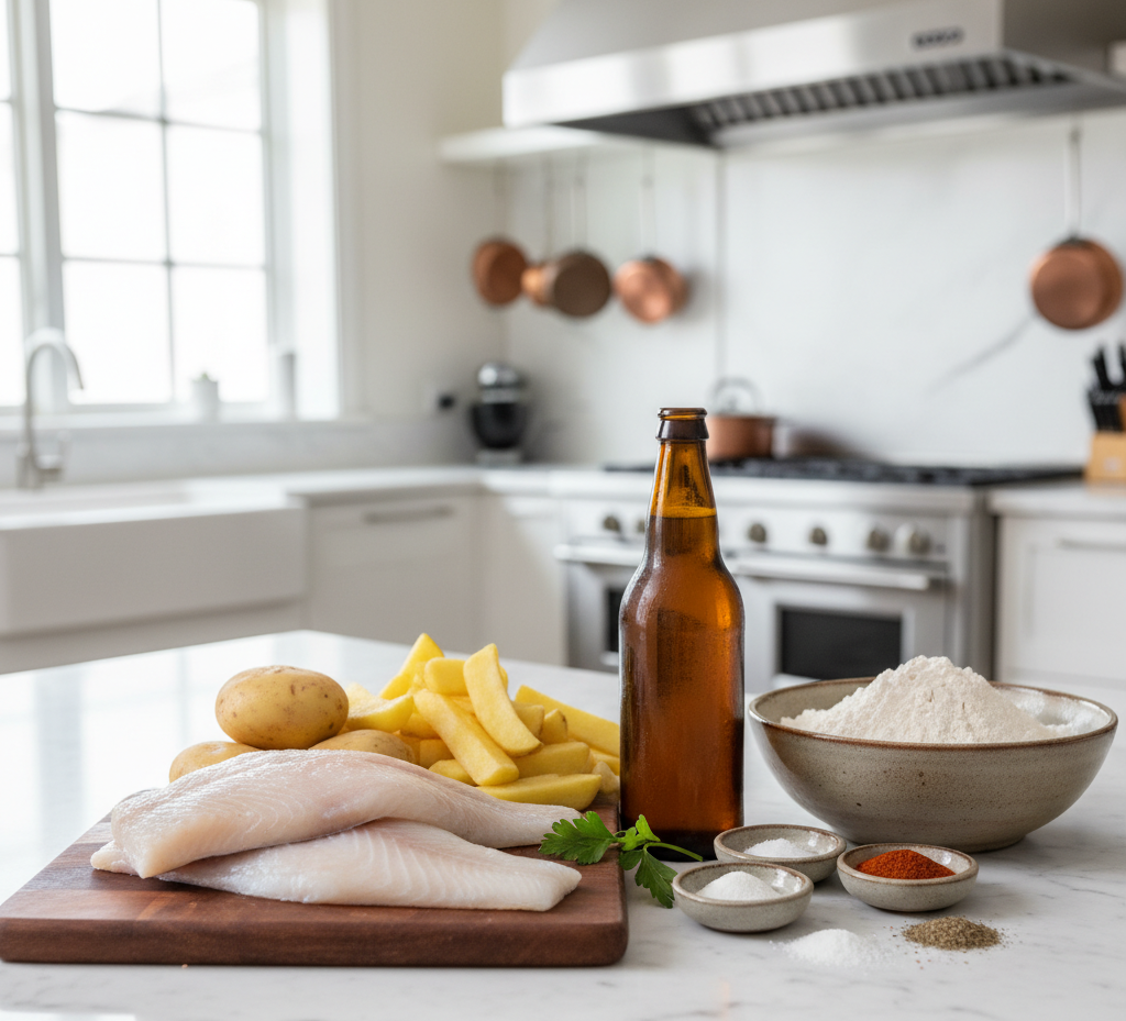 Ingredients for Crispy Beer Battered Fish and Chips