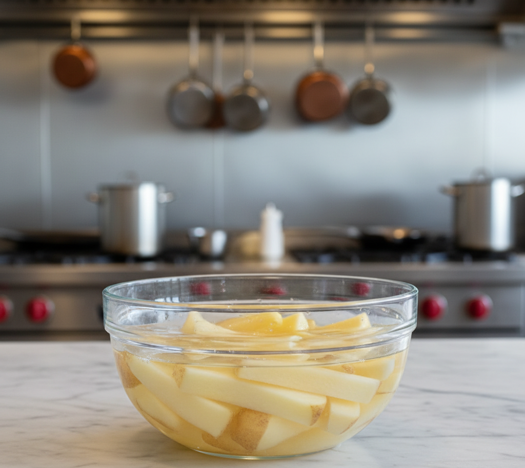 Peel and cut potatoes into thick fries. Soak them in cold water for at least 30 minutes to remove excess starch. Drain and pat completely dry.