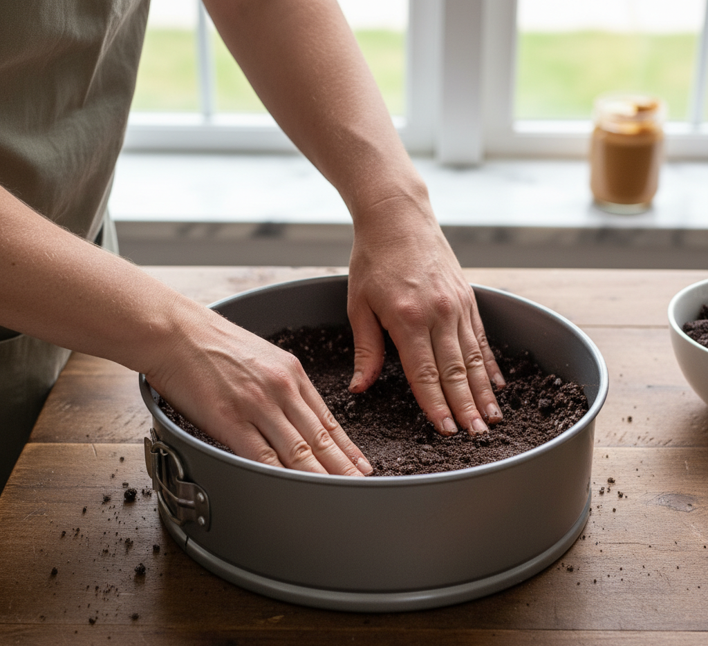 Combine crushed cookies with melted butter and press firmly into the bottom of a springform pan. Freeze for 15–20 minutes to set.