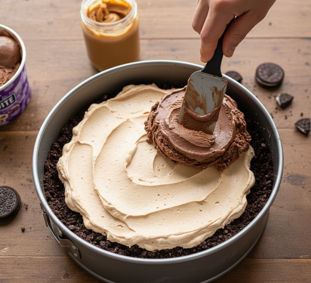 Spread softened chocolate ice cream evenly over the crust. Smooth the top and freeze for 30 minutes.