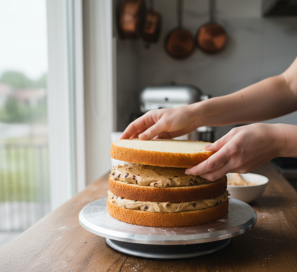 Place one cake layer on a serving plate. Spread a thick layer of cookie dough, then top with the second cake layer. Frost the entire cake evenly.