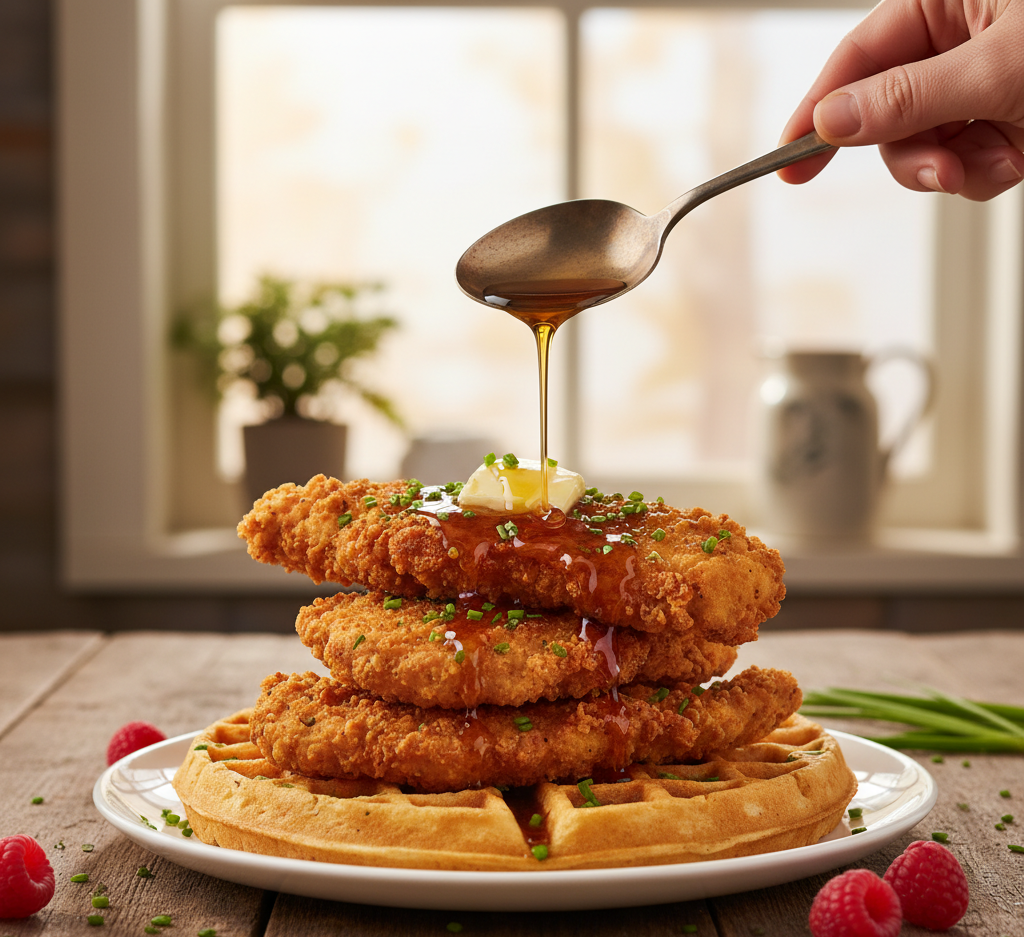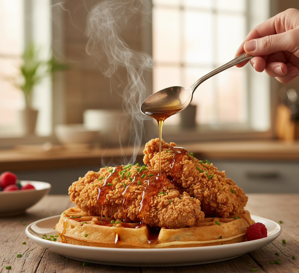 This Delicious Chicken and Waffles Recipe with Homemade Maple Syrup is the perfect combination of comfort and indulgence. With crispy fried chicken, fluffy waffles, and rich homemade syrup, every bite is packed with flavor and texture.