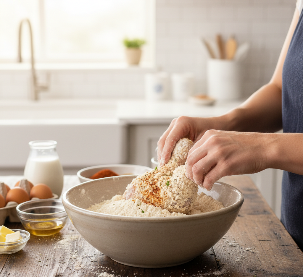 In a bowl, mix flour, cornstarch, and spices. Dredge the marinated chicken in the mixture, pressing firmly to create a crispy coating.