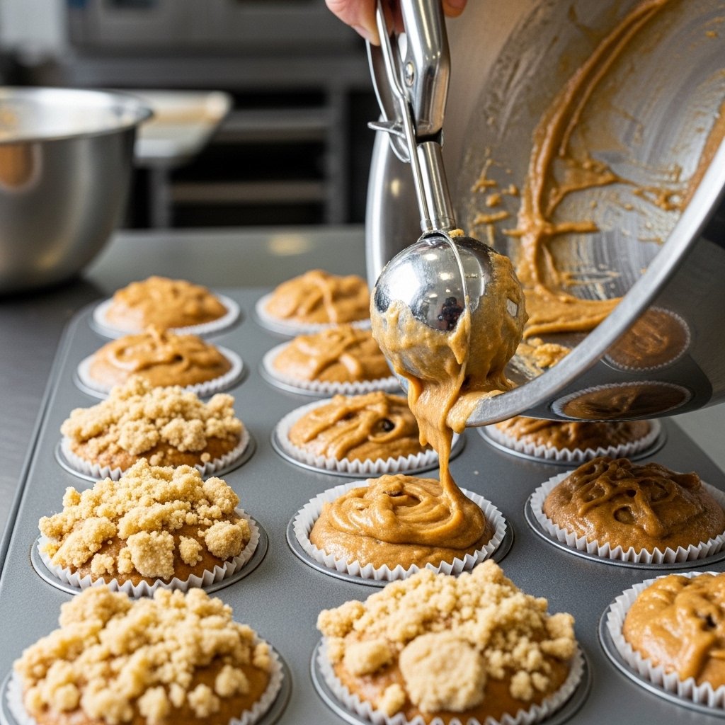 Fill muffin cups ¾ full, sprinkle streusel on top, and bake for 18–22 minutes.
