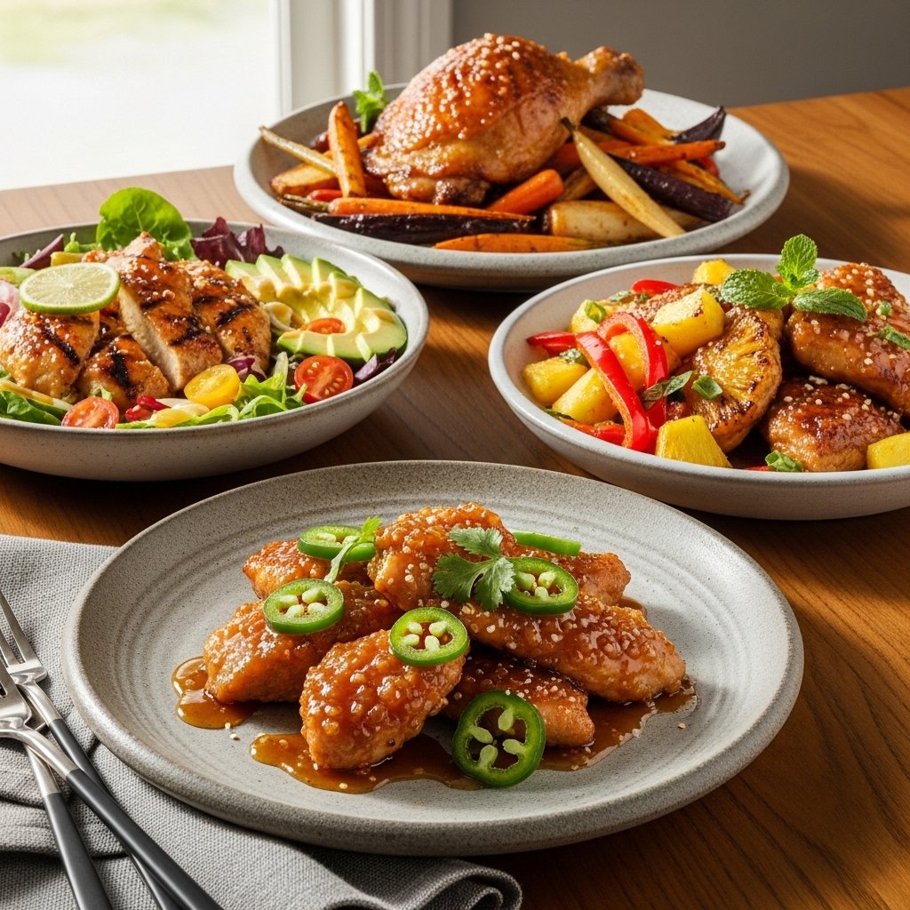 including spicy version with jalapeños, low-carb bowl with greens, tropical version with pineapple, and oven-baked version, arranged on a dining table, bright natural lighting, high-end food photography, 4k resolution