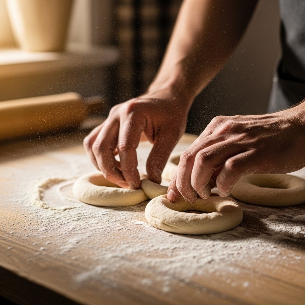 Divide into equal portions, roll into ropes, and connect the ends to form bagel shapes.