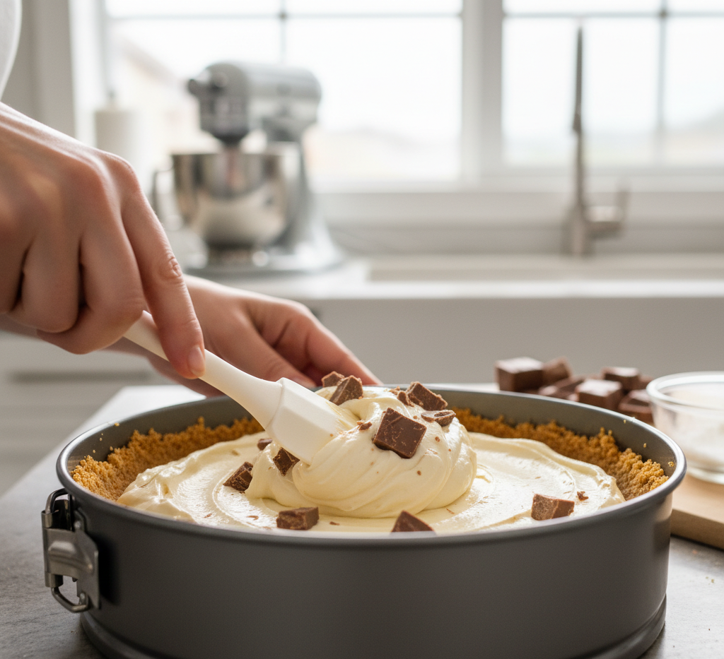 Fold in chopped Twix bars, ensuring they’re evenly distributed throughout the filling.