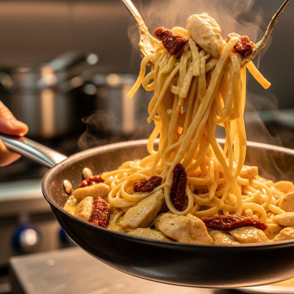 Add cooked pasta and sliced chicken back into the skillet. Toss everything together until well coated. Add a splash of reserved pasta water if needed to loosen the sauce.