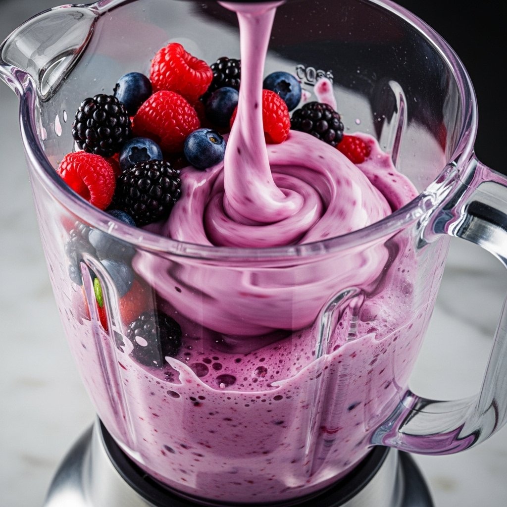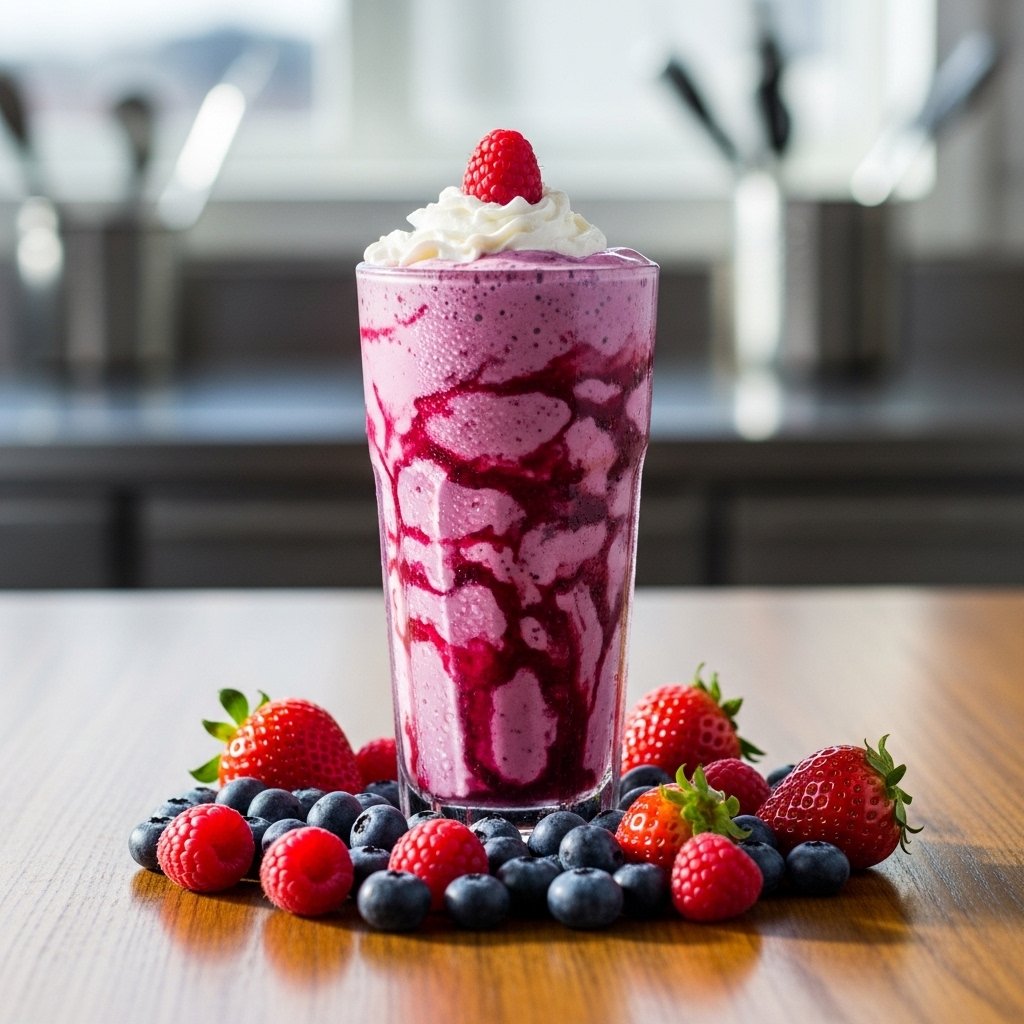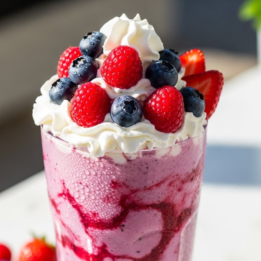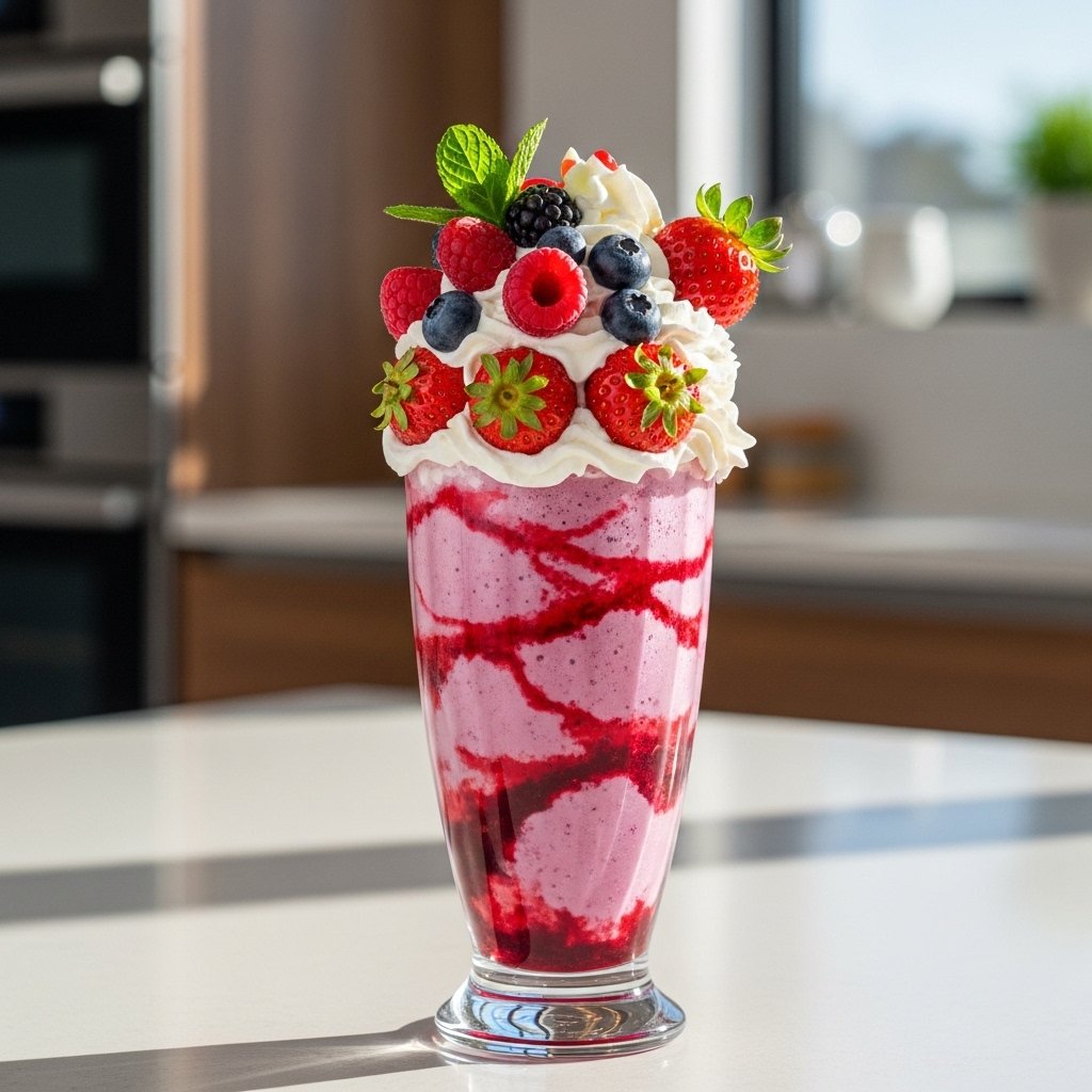Pour into tall glasses, top with whipped cream, and garnish with fresh berries. Serve immediately for the best texture and flavor.