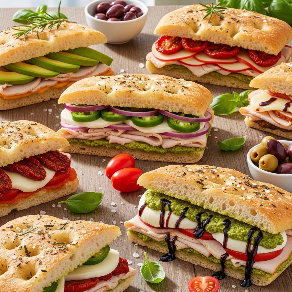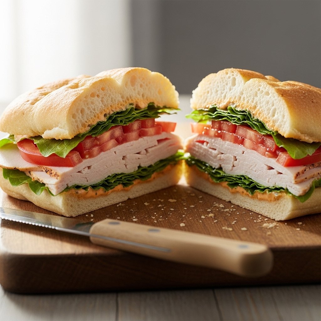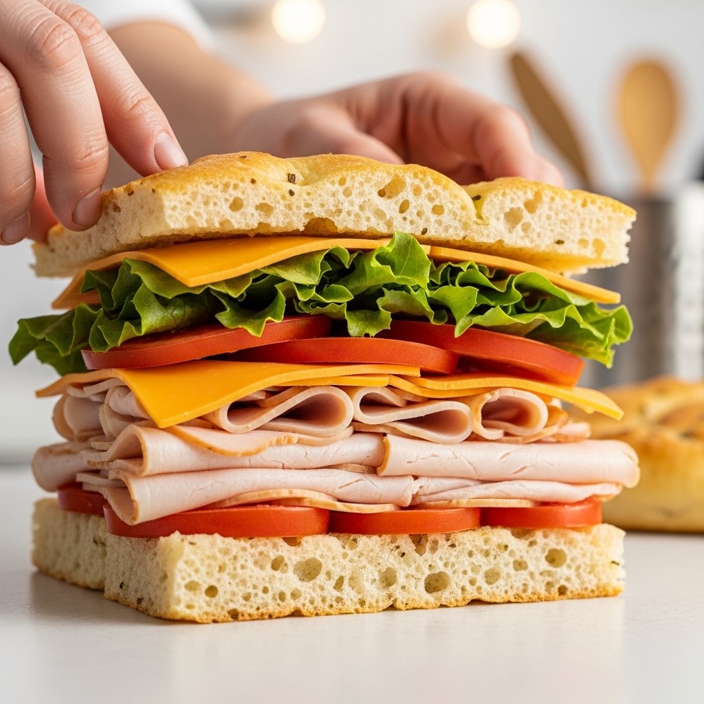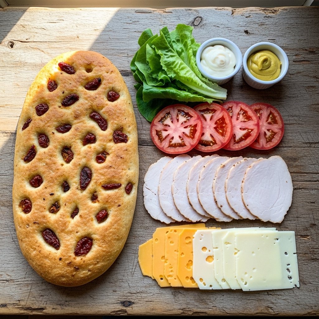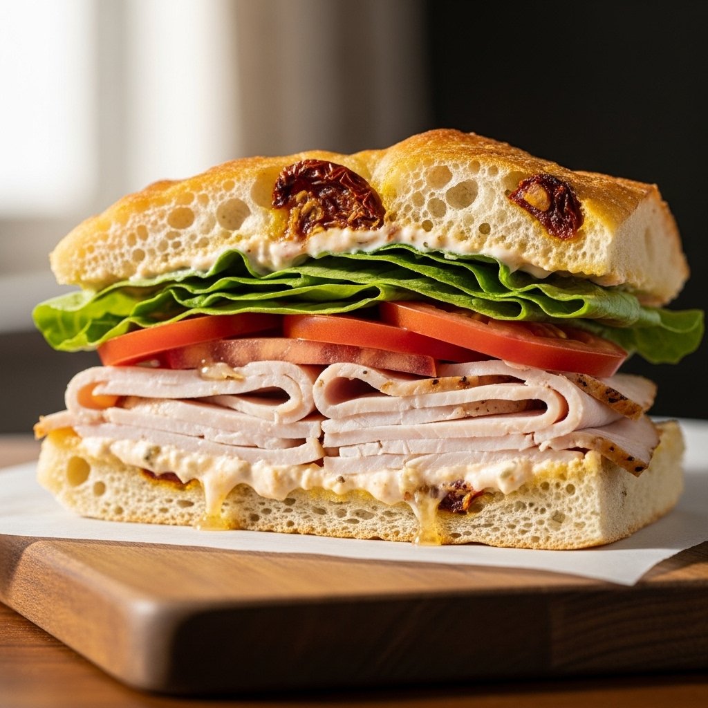 The star of this recipe is the sun-dried tomato focaccia—soft, fluffy, and infused with savory flavor. Combined with tender turkey slices, crisp vegetables, and a creamy spread, every bite is layered, satisfying, and incredibly delicious.